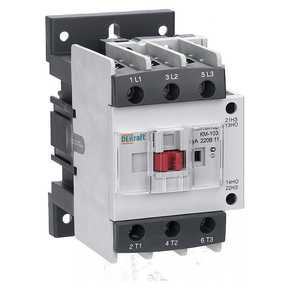 Контактор серии КМ-103 DEKraft; 3P; номинальный ток – 65 А (AC3); напряжение управления 220 В пер.тока; доп.контакты – 1НО+1НЗ; установка – на стандартную DIN-рейку. Контакторы КМ-103 предназначены для пуска и останова асинхронных двигателей, для коммутации различных нагрузок в сетях напряжением до 690 В пер.тока. Дополнительные защитные крышки исключают попадание пыли внутрь контактора и обеспечивают защиту от случайного прикосновения.