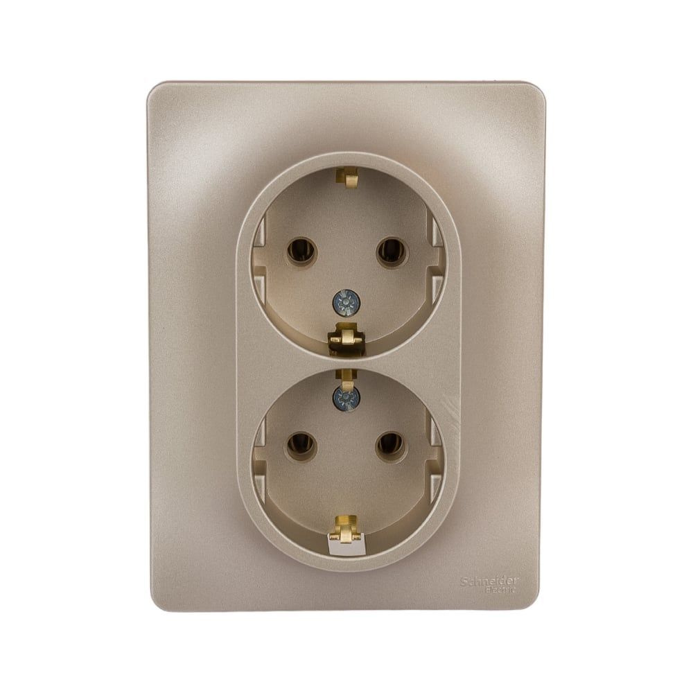 Розетка двойная Schneider Electric Glossa (в сборе, цвет титан) с заземлением, без шторок подходит для сетей 250 В, на ток 16 А. - Заземляющий контакт обеспечивает дополнительную защиту от удара электрическим током. При наличии заземления электрический потенциал уходит в землю, защищая человека. - Выполнен из материала PС+ASA, стойкого к УФ-излучению и появлению царапин. - Двойная розетка позволяет подключить два устройства в одном месте.